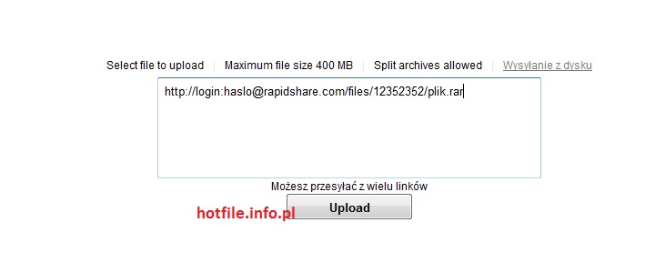 Możemy również wykonać remote upload z różnych innych stron, możliwy jest również HF to HF czyli działa na takiej samej zasadzie jak z rapidshare tylko link który wklejamy wygląda w ten sposób: